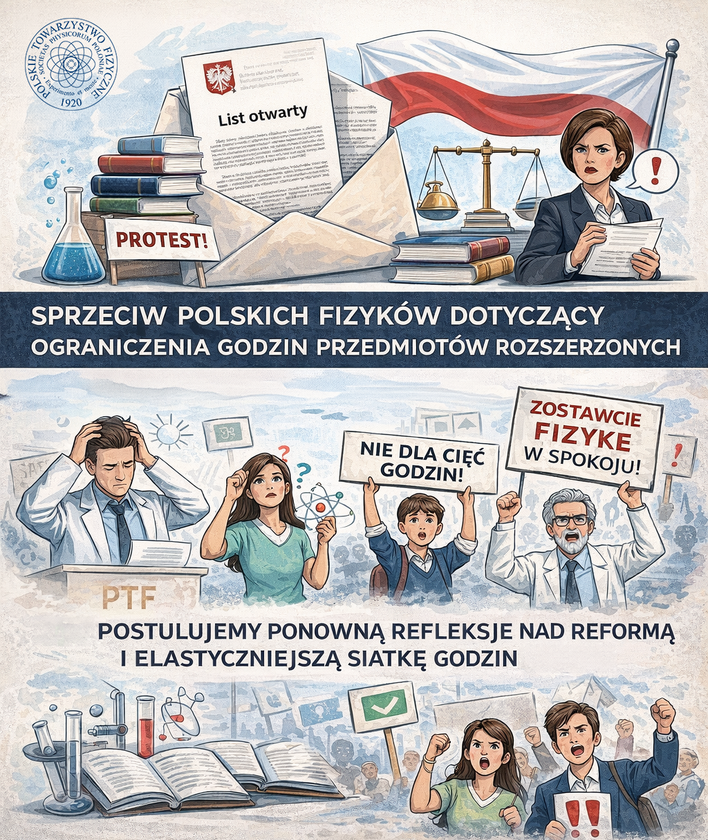 W imieniu społeczności Polskiego Towarzystwa Fizycznego, reprezentującej fizyków pracujących na polskich uczelniach i w instytutach naukowych oraz nauczycieli fizyki, pragniemy zaprotestować przeciwko propozycji MEN dotyczącej planowanych zmian w siatce godzin szkół ponadpodstawowych tj. przeciwko drastycznemu zmniejszeniu liczby godzin przedmiotów realizowanych w zakresie rozszerzonym z 22 do 18. Przedmioty realizowane w zakresie rozszerzonym są ściśle powiązane z wyborem przedmiotów na egzaminie maturalnym i kluczowe dla podjęcia studiów wyższych na kierunkach istotnych dla rozwoju nowoczesnej gospodarki.