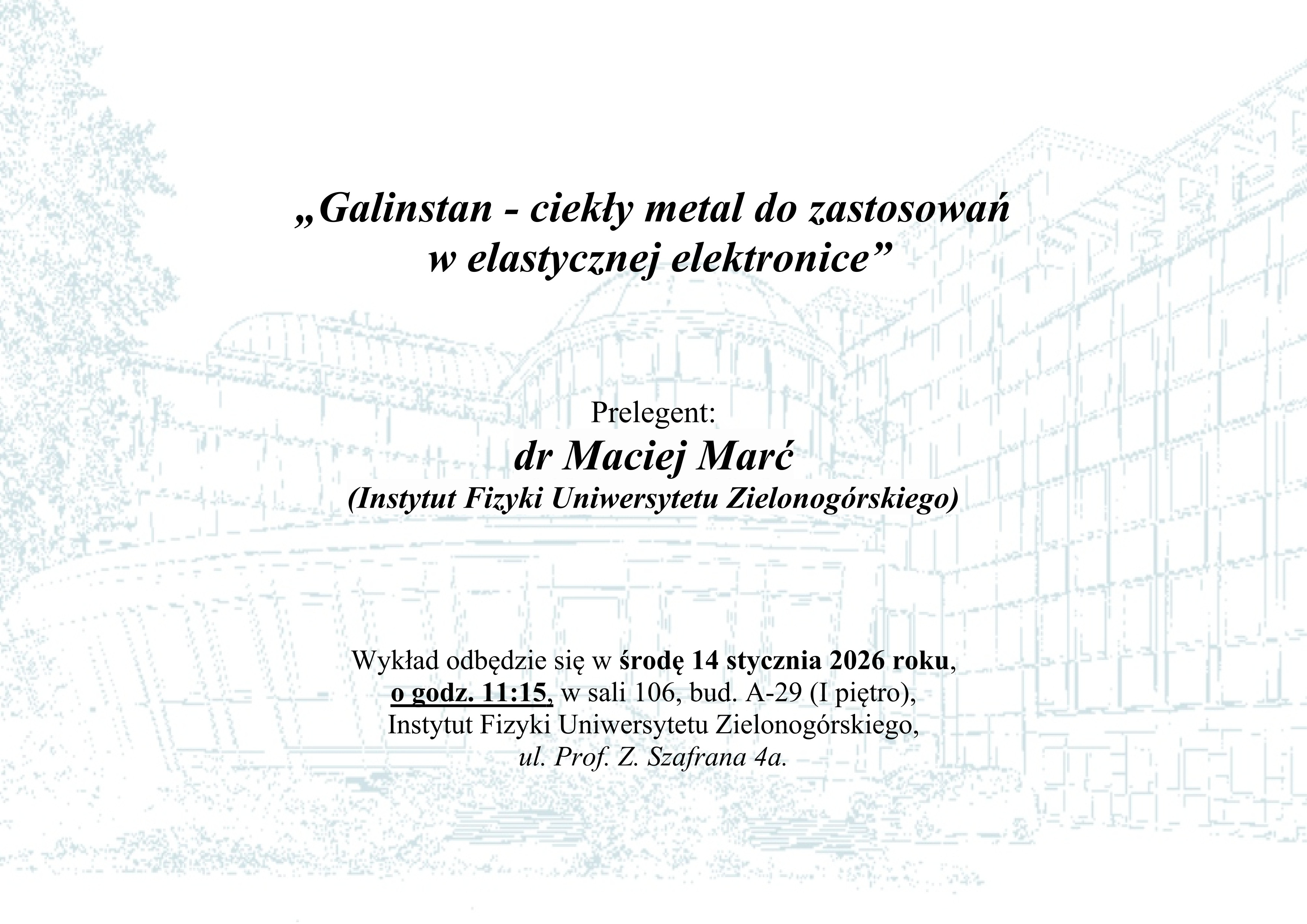 Instytutu Fizyki Uniwersytetu Zielonogórskiego wraz z Zielonogórskim Oddziałem PTF zapraszają na wykład, który odbędzie się 14 stycznia 2026 roku o godz. 11:15. w sali 106, bud. A-29 (I piętro) w Instytucie Fizyki Uniwersytetu Zielonogórskiego, ul. Prof. Z. Szafrana 4a. Wykład pt. "Galinstan - ciekły metal do zastosowań w elastycznej elektronice" wygłosi dr Maciej Marć.